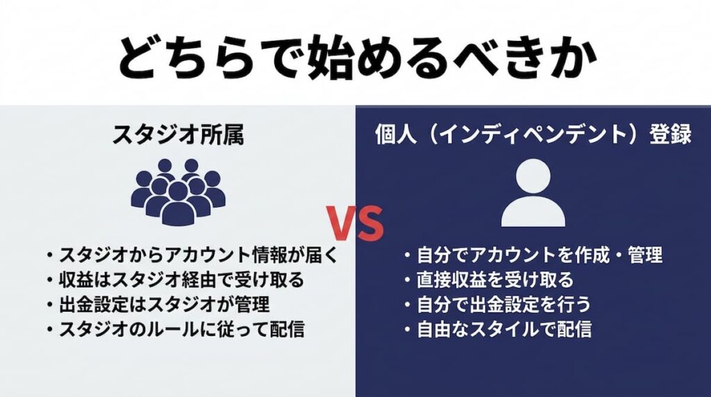 スタジオに所属せず個人で配信を始める方も、同じ手順で登録できます。