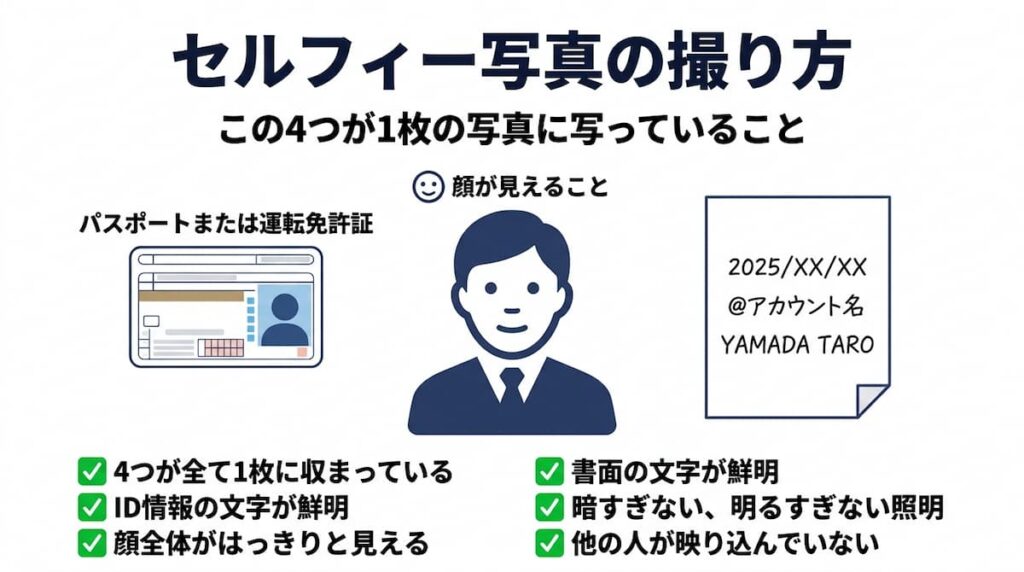 撮影前に白い紙へ必要事項を手書きしておき、身分証明書と一緒に持った状態で顔と一緒に撮影してください。