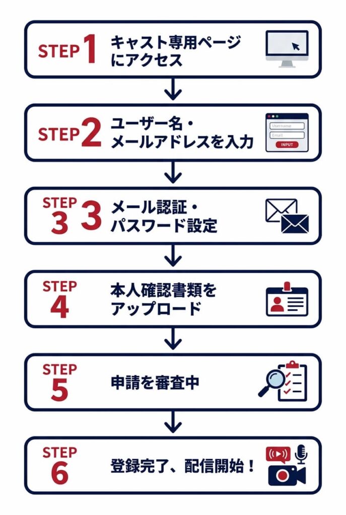 キャストアカウントの作成は、メール認証・本人確認・プロフィール設定の順で進みます。